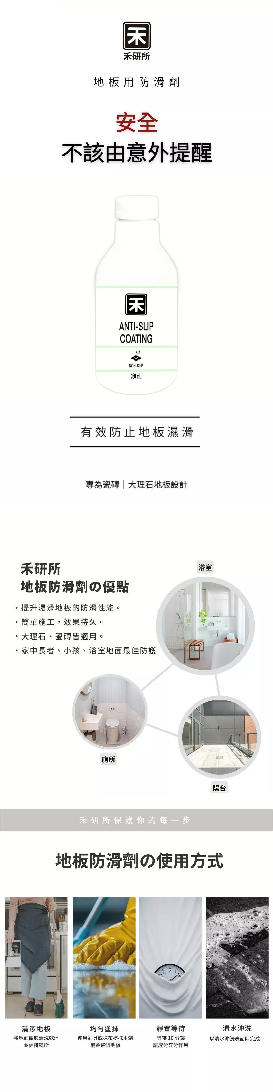 浴室地板清潔後擦乾,將防滑劑均勻塗在地板,等待15分鐘,再用水沖洗乾淨即可。