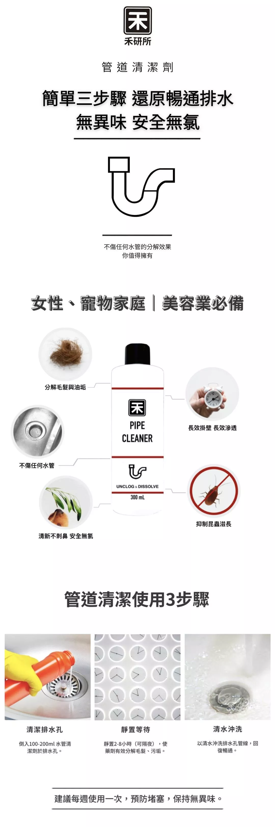 倒入約 100–200 mL 藥劑於排水口, 靜置2–8 小時(可隔夜),再以大量清水沖洗即可,建議每週使用一次以維持暢通。